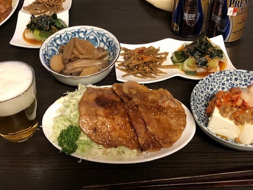 メニューはビールの横から、豚肉を今半のたれで焼いたもの・キムチ納豆豆腐・ネギとワカメのぬた・きんぴらごぼう・里芋と大根と手羽先煮。