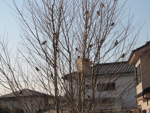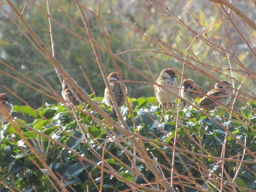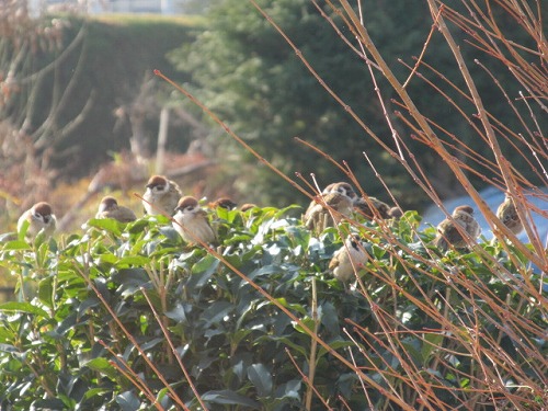 また、スズメたちはキンモクセイの木の上の方にのっかるのも大好き。