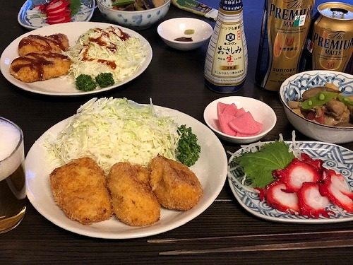 メニューはビールの横から、カニクリームコロッケ・酢だこ・煮しめ・さくら大根。