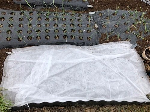 月曜の寒さが凄かったので、まだ発芽してこないスナップエンドウには不織布をベタ掛けにしておきました。