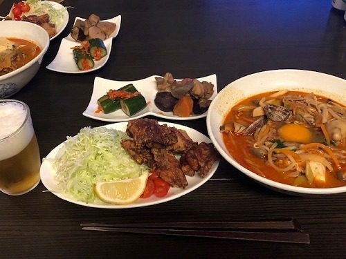 メニューはビールの横から、鶏のから揚げ・スンドゥブ・筑前煮・オイキムチ。
