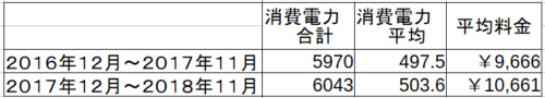 グラフをよく見ると、前年(薄い色の方)より使用量が増えてる月が多いことが分かるので、どれ位多かったのか?平均値を表にしてみました。
