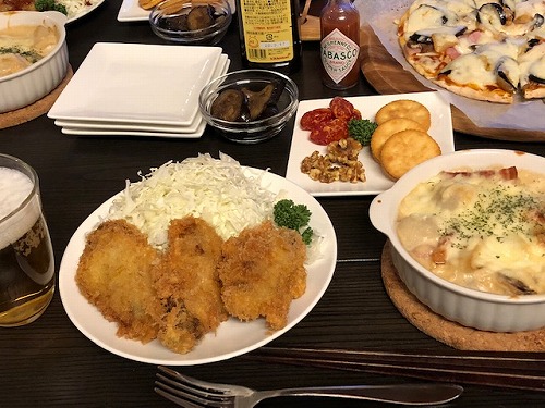 メニューはビールの横から、カキフライ・里芋とベーコン、マッシュルームのグラタン・ナスガーリックピザ・リッツサンド・ドライトマト・カレークルミ・ナスのバルサミコ酢マリネ。