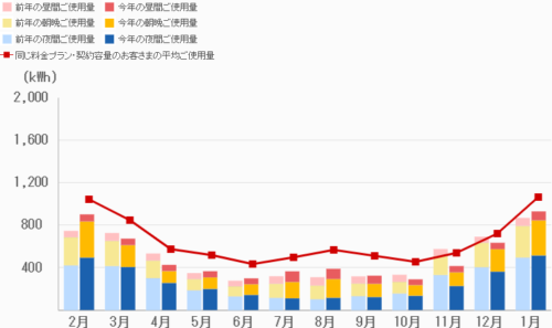 我が家の電力使用量は棒グラフで、折れ線グラフは同じ料金プラン・契約容量のお客様の平均使用量。