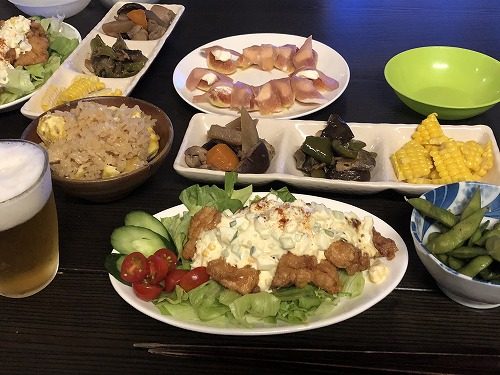 メニューはビールの横から、チキン南蛮・枝豆・とうもろこし・ナスとピーマンの揚げびたし・煮物・栗ご飯・イチジク生ハム。