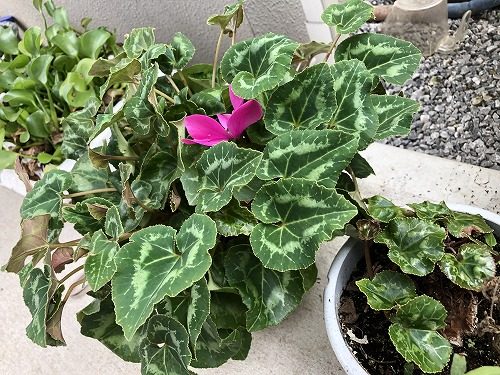 ええっ! シクラメンって冬の風物詩みたいな花だと思ってましたが、夏越し中に咲いちゃってました。