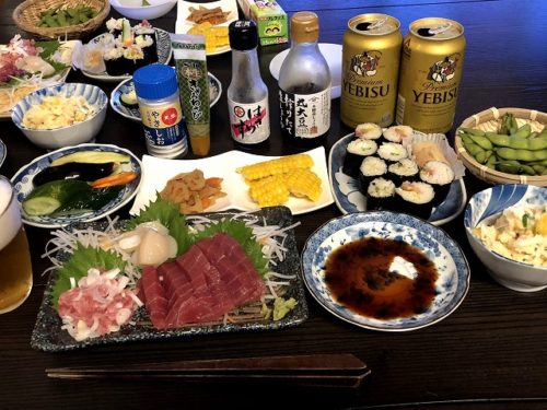 メニューはビールの横から、マグロ、ネギトロ、ホタテの刺身・ポテトサラダ・枝豆・海苔巻き各種・トウモロコシ・きんぴらレンコン・ナスとキュウリとニンジンの浅漬け。