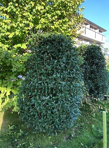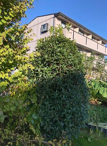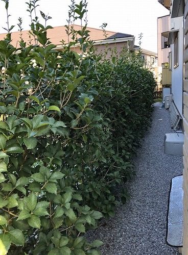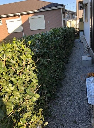 家の北側のヒイラギモクセイの生垣と、南側のキンモクセイ、ギンモクセイの剪定作業。