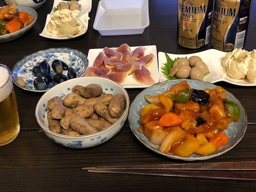 メニューはビールの横から、茹で落花生・酢鶏・茹でカリフラワー・ウズラの味玉・イチジク生ハム・ナスの漬物。