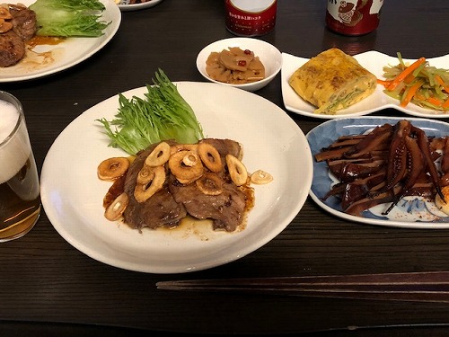 メニューはビールの横から、まぐろほほ肉のステーキ・柔らかあたりめ・セロリとニンジンの塩きんぴら・厚焼き玉子・きんぴらレンコン。