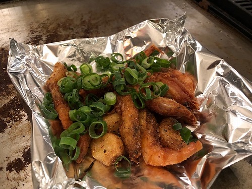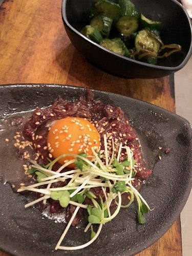 サイドメニューのユッケと川エビから揚げ。