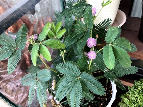 ウッドデッキ上に目をやると、オジギソウが花を咲かせてます。