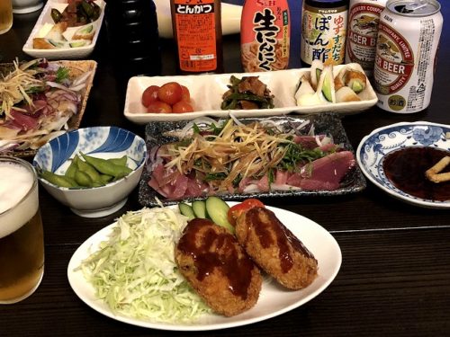 メニューはビールの横から、えびカツ・カツオの刺身・枝豆・プチトマトの甘酢漬け・ピーマンとベーコン炒め・キュウリインちくわ。