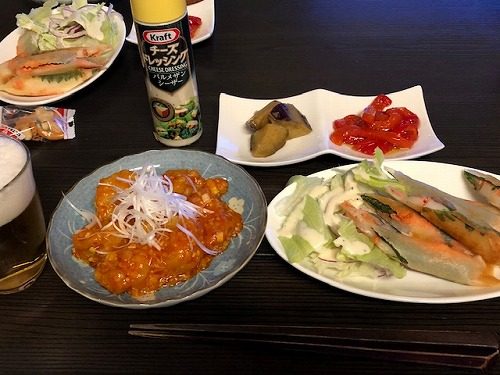 メニューはビールの横から、エビチリ・もちメンタイ春巻き・パプリカマリネ・さつまいもの煮物。