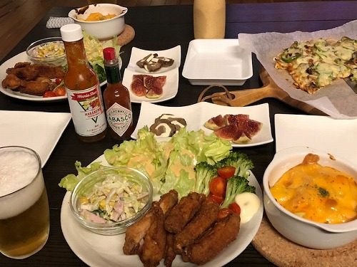 メニューはビールの横から、鶏手羽のから揚げ・サラダ・コールスローサラダ・明太じゃがのチーズ焼き・ピザ・いちじく・いぶりがっこチーズ。