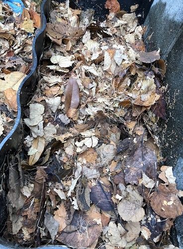 コンポストの中から今まで入れていた落ち葉を取り出してみると、既に腐葉土化したものが下のほうに有りましたので、最近拾ったカサカサの落ち葉と混ぜて、再度コンポストの中に投入。