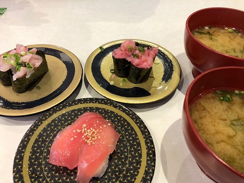 まずは、クーポンで無料になったお味噌汁とづけ・中落ち軍艦・まかない軍艦