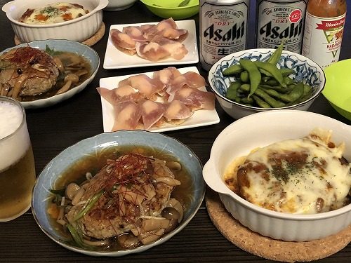 メニューはビールの横から、和風きのこハンバーグ・イタリアナスのチーズ焼き・枝豆・イチジク生ハム。