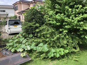 生ごみ処理用のキエーロ(波板のヤツ)の中からカボチャの種が発芽してしまい、色々な所に絡みついてこの有り様です。