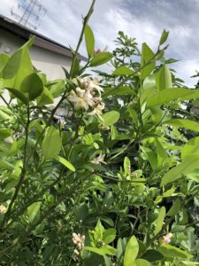 この前、キンモクセイに絡みついたやつの蔓を切り離して菜園側に誘引したのですが、それ以外にもキンモクセイの中の方からも蔓が出てくるわ、ムラサキシキブにも絡み付くわで、大変なことになっちゃってます。