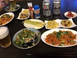 メニューはビールの横から、ナスのたたき・豚キムチ・サツマイモの煮物・茹でトウモロコシ・焼きヤングコーン・プチトマトの甘酢漬け。