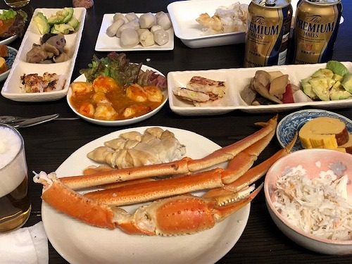 メニューはビールの横から、ズワイガニ・カニのほぐし身・自家製伊達巻・アボカド・煮しめ・海老のすり身焼き・エビチリ・きぬかつぎ。