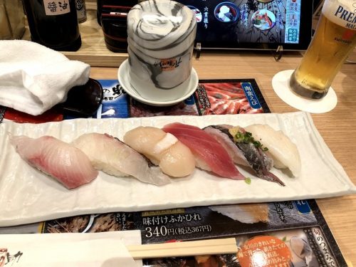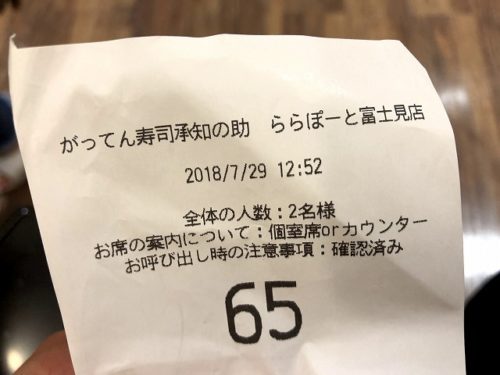いろいろなお店が入ってますが、今回はがってん寿司がやってる承知の助に並びました。