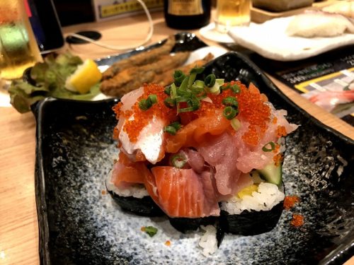 海宝巻は、たくあん巻きの上に、マグロや白身、サーモンなどがどっさり載っかったもの。