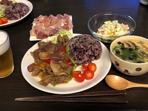 メニューはビールの横から、豚肉と玉ねぎの炒め物・黒米入りライス・プチトマト・茶碗蒸し・コールスローサラダ・イチジク生ハム。