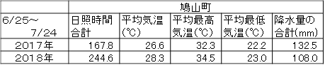 毛呂山町の隣町の鳩山町の去年と今年の6月25日~7月24日までの日照時間や気温などを表にしてみました。