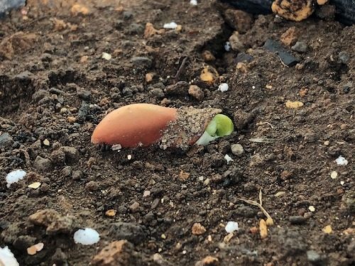 庭に出てみると、簡易ハウスの中で育ててるソラマメが発芽してきてます。