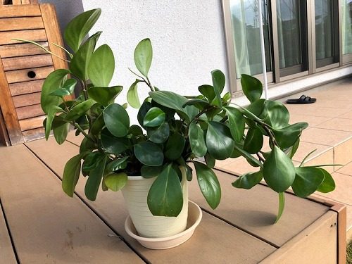 この前の日曜日、いつもはピーンと上に向かって成長してたペペロミアがこんな状態に~~。