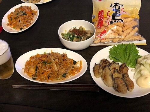 メニューはビールの横から、豚キムチ・牡蠣のソテー・茹でカリフラワー・ザーサイ。