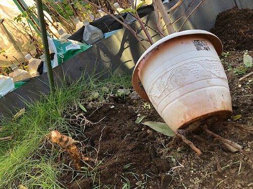 仕方がない、鉢の底の土をスコップで掘って、無理やり引っこ抜きました。