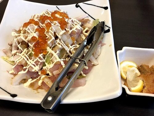 おつまみは、海鮮カルパッチョにタコのから揚げ