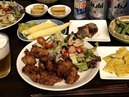メニューはビールの横から、から揚げ・サラダ・茹でトウモロコシ・枝豆・メバルのチーズ漬け・焼きヤングコーン・サツマイモの煮物。