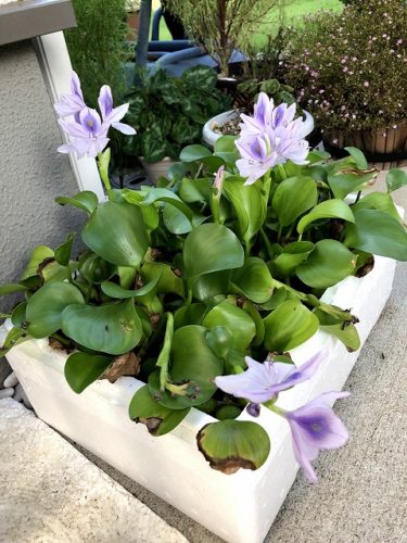おっ! 庭に行く前にホテイアオイの花がイイ感じで咲いていました。