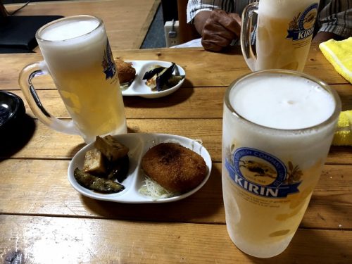 今日のお通しは、カレーコロッケとナスと厚揚げの煮物。