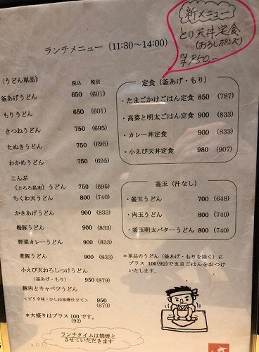 で、メニューを見直したら、うどんを作ってるおじさんの絵の上に、※単品のうどんにプラス¥100で五目ごはんをお付けいたします。だって~。