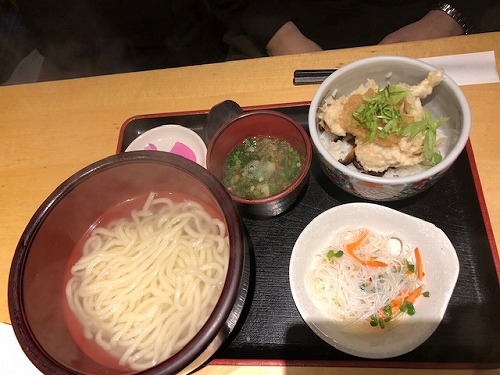 息子は、とり天丼定食。