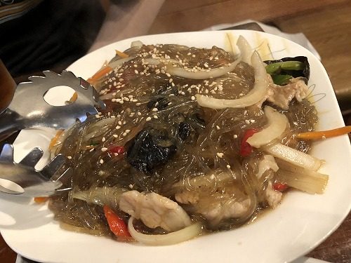 飲み物とチーズタッカルビ2人前を頼むと、息子がチャプチェも食べたいと言い出したので、それもオーダー。